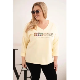 Dámská mikina Plus Size s nápisem a výstřihem do V žlutá