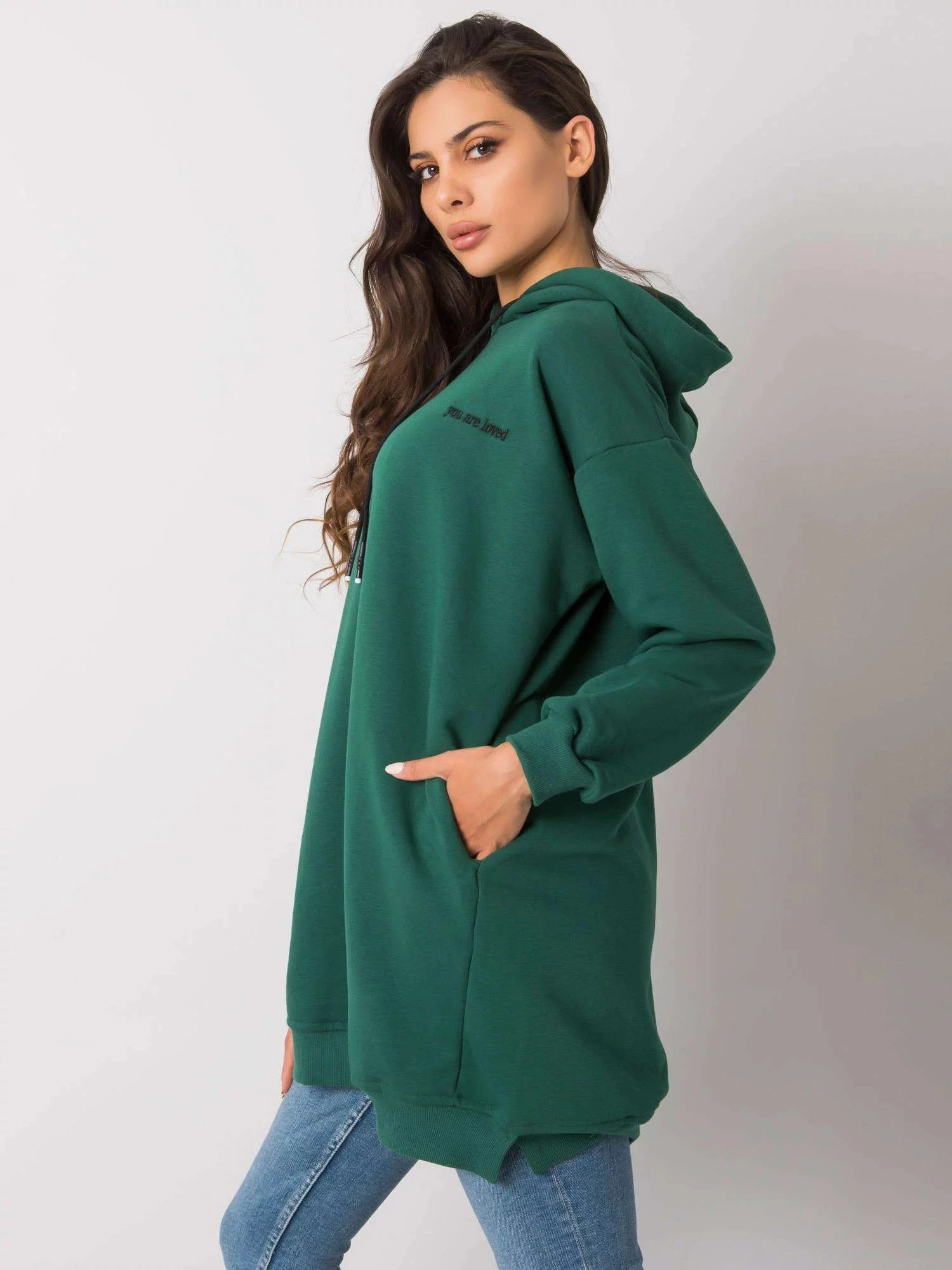 Tmavě zelená dámská mikina s kapucí.