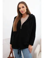 - Střih: delší mikina s kapucí, šňůrkou a zipem