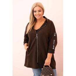Tato dámská mikina plus size je vynikající volba pro ženy, které si cení pohodlí a módního, volného stylu. Vyrobena z měkké směsi polyesteru, viskózy a elastanu, skvěle sedí na postavě a neomezuje pohyb. Model s rozepínáním na zip a dekorativním kroužkem u zipu dodává moderní charakter, a kapuce zvyšuje funkčnost. Na rukávu se nachází módní potisk ve streetwear stylu, který přitahuje pozornost a podtrhuje sportovní styl mikiny.