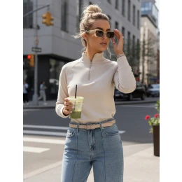 Dámská mikina ve vypasovaném střihu s praktickým zipem pod krkem. Stojatý límec zklidňuje výstřih a chrání krk v chladnějších dnech. Elastický úplet podporuje volnost pohybu a pohodlné usazení na siluetě. Model je ideální pro každodenní oblečení, kdy je důležité pohodlí a elegantní provedení.