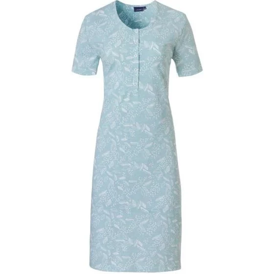 Dámská noční košile s krátkým rukávem od značky Pastunette. Noční košile je světle tyrkysové barvy. Látka má vzor s tečkami, listy a fazolemi s hráškem. Pod krkem je zapínání na knoflíky. Noční košile je vyrobena z jemné bavlny.