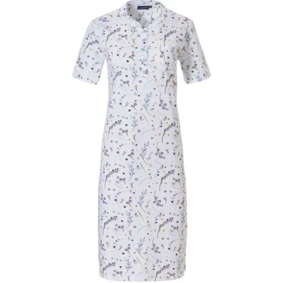 Dámská dlouhá bílá noční košile od značky Pastunette. Noční košile má krátké rukávy a potisk ptáčků a větviček s květinami. Pod kulatým výstřihem je řada knoflíků.