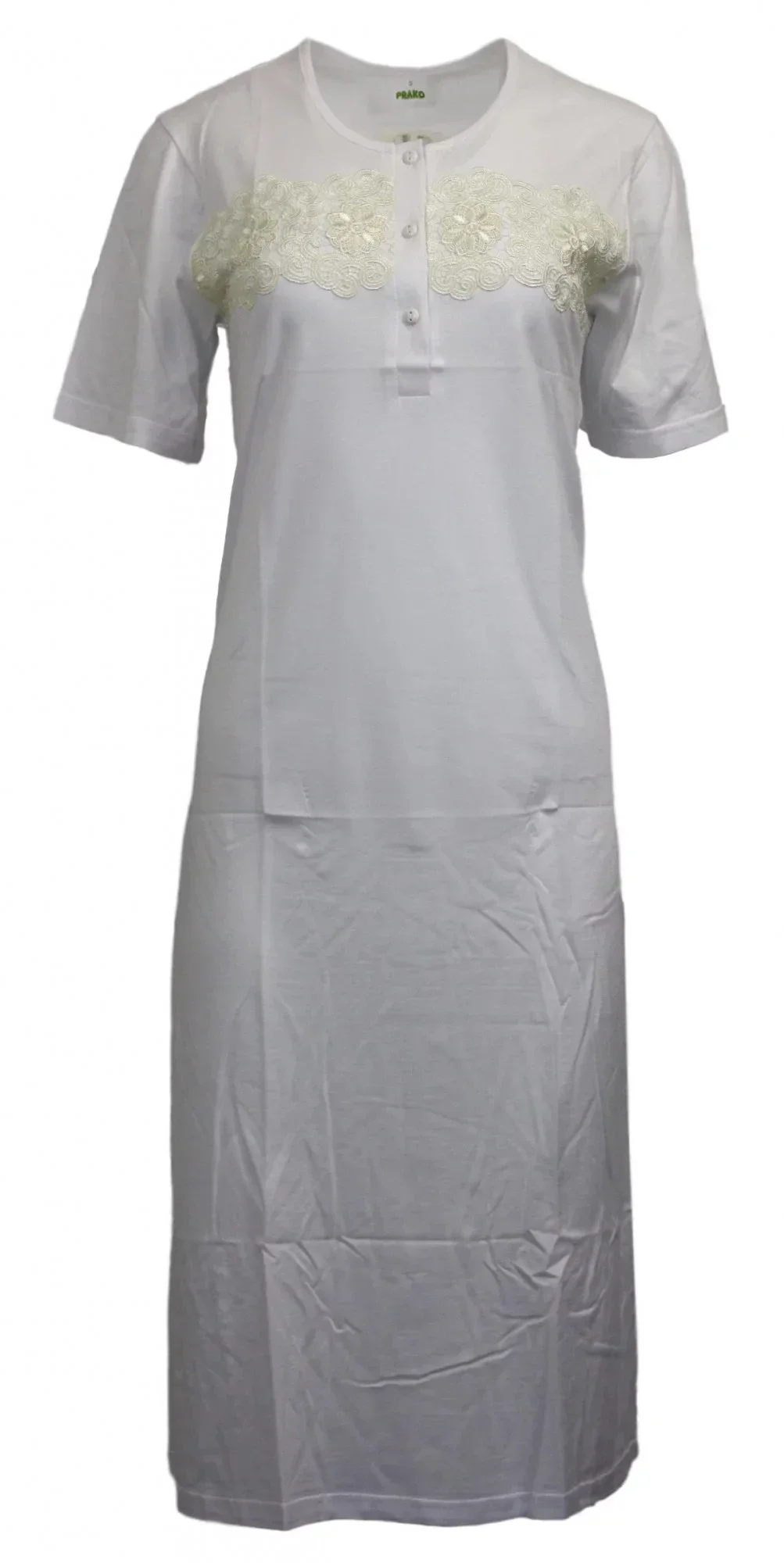 Dámská nočí košile F 1032 Prako - Gemini dlouhá, kolem krku do kulatá ve předu na tři knoflíky.Barva bílá jen nahoře u knoflíku je krajka barvy smetanové. Materiá 50% bavlna, 50% modal.