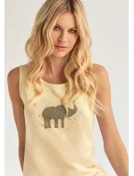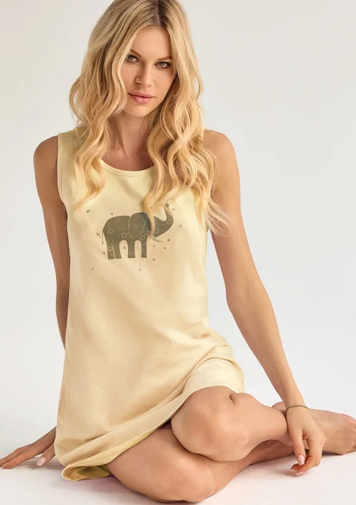 Dámská noční košile od italské značky Infiore. Košile má kulatý výstřih, nemá rukávy. Košile je ušitá z příjemné bavlny. Na hrudi je natištěný obrázek slona, který je doplněný zlatými aplikacemi. Délka košile je nad kolena. Je balena v dárkové krabici.