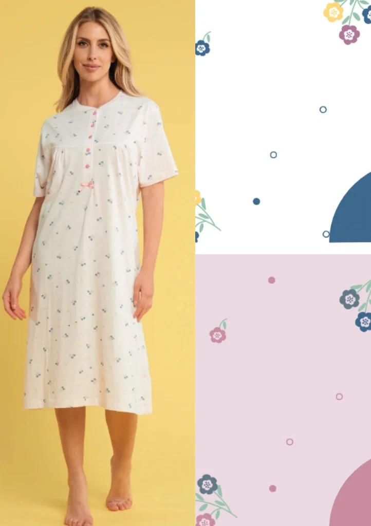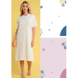 Dámská noční košile od italské značky Karelpiu ze 100% bavlny. Noční košile s krátkým rukávem a motivem kytiček má kulatý dekolt a propínací légu na 5 knoflíků. Na spodu légy je malá ozdobná mašlička. Délka je pod kolena. Je ušitá ze 100% bavlny a proto se v ní budete cítit velmi příjemně.
