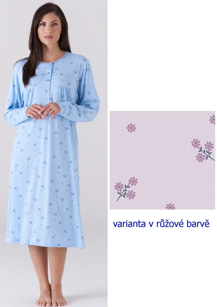 Dámská noční košile od italské značky Karelpiu. Splývavá noční košile rovného střihu má dlouhý rukáv ukončen širokou manžetou s knoflíčkem a délku pod kolena. Kulatý výstřih má rozepínací légu s 5 knoflíčky. V oblasti hrudníku je košile prostřihlá a mírně řasená. Noční košile je z bavlněného jersey materiálu, který se vyznačuje vysokou prodyšností, savostí a je velmi příjemný na omak. Budete se v ní cítit velmi příjemně i v letních měsících.