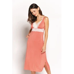 Novinka! Výrazná, hladká noční košilka v dlouhém provedení, vyrobená z měkkého, pružného úpletu, s hlubokým výstřihem stylově zakončeným krajkou. Mimořádně romantická, s jemným, delikátním, ženským půvabem. Tenká ramínka, umožňující odhalit výstřih i ramena. 94 % viskóza, 6 % elastan.