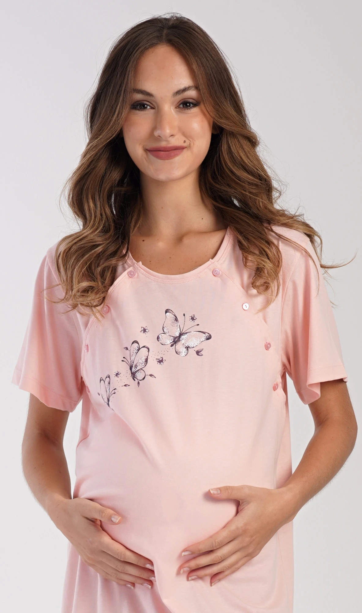 Dámská bavlněná mateřská noční košile s krátkým rukávem Butterfly. Noční košile je svým střihem určená na dobu těhotenství, do porodnice i ke kojení. Ke kojení slouží průstřihy po stranách košile, které jsou uzavíratelné na knoflíky. Jednobarevná košile je ozdobena obrázkem motýlků. Použitý materiál s podílem bavlny 100% je příjemný a poddajný na dotek.