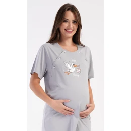 Dámská bavlněná mateřská noční košile Čáp s miminkem. Noční košile je svým střihem určená na dobu těhotenství, do porodnice i ke kojení. Ke kojení slouží průstřihy po stranách košile, které jsou uzavíratelné na knoflíky. Jednobarevná košile je na hrudi ozdobena obrázkem čápa, který nese v zobáku kotě. Použitý materiál s podílem bavlny 100% je příjemný a poddajný na dotek.