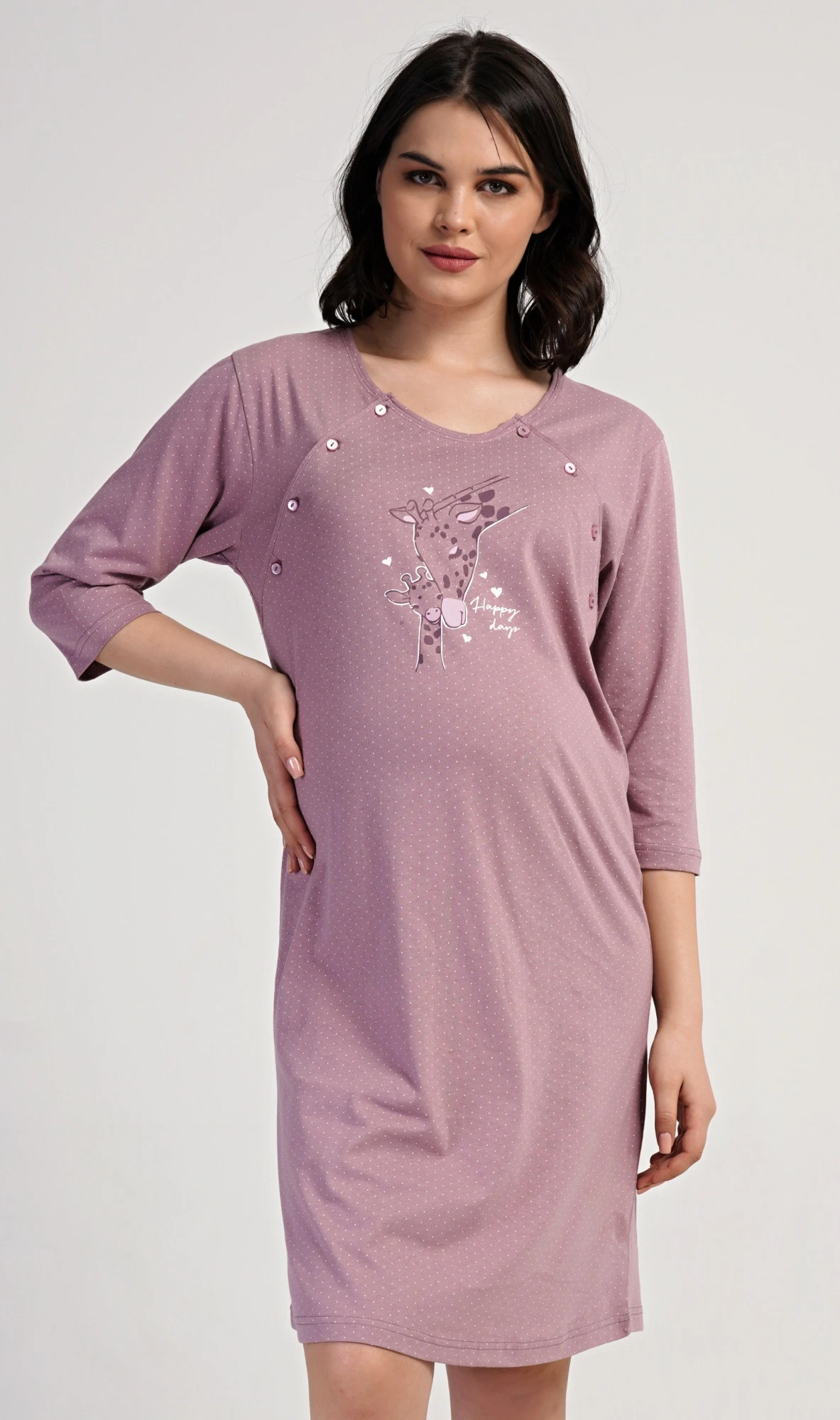 Dámská bavlněná mateřská noční košile s tříčtvrtečním rukávem Emily. Noční košile je svým střihem určená na dobu těhotenství, do porodnice i ke kojení. Ke kojení slouží průstřihy po stranách košile, které jsou uzavíratelné na knoflíky. Jednobarevná košile je ozdobena obrázkem pandy s miminkem. Použitý materiál s podílem bavlny 100% je příjemný a poddajný na dotek.