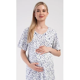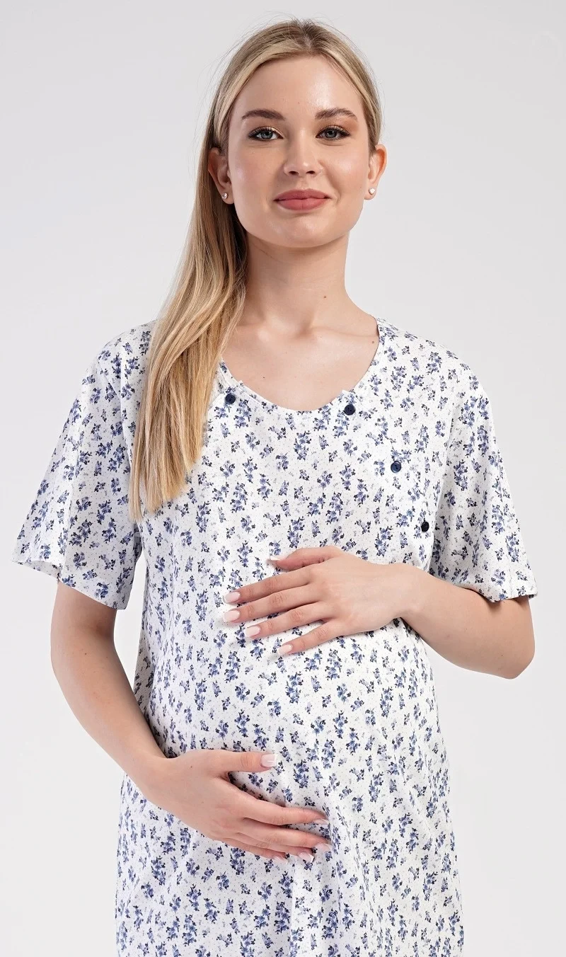 Dámská bavlněná mateřská noční košile Flowers. Noční košile je svým střihem určená na dobu těhotenství, do porodnice i ke kojení. Ke kojení slouží průstřihy po stranách košile, které jsou uzavíratelné na knoflíky. Košile je potištěna drobnými modrými květy. Použitý materiál s podílem bavlny 100% je příjemný a poddajný na dotek.