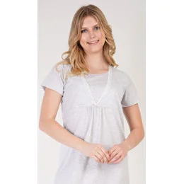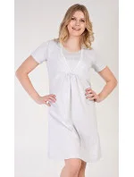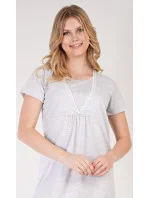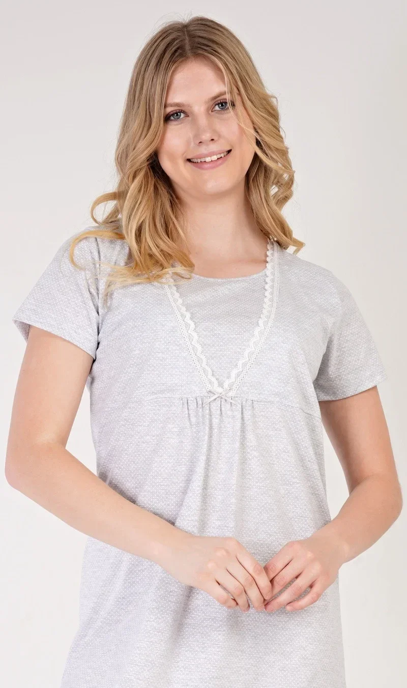Dámská mateřská noční košile s krátkým rukávem Jana. Noční košile je potištěna drobnými puntíčky. Je přizpůsobená ke kojení, v oblasti prsou má otvory pro pohodlnou a rychlou manipulaci, které jsou ozdobené jemnou krajkou. Mateřská košile je díky volnějšímu střihu vhodná i v těhotenství a do porodnice. Materiál s podílem bavlny 70% je poddajný a příjemný na dotek.