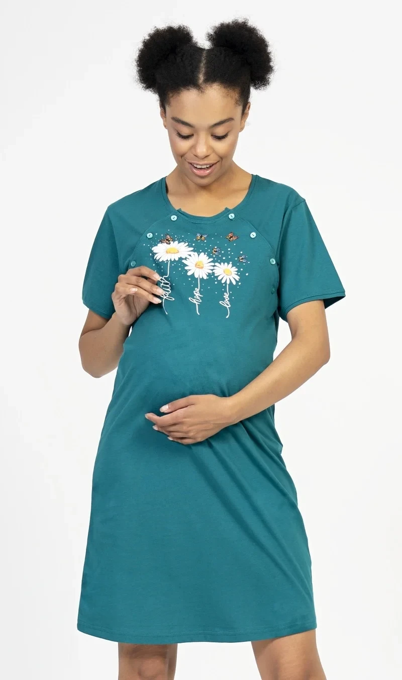Dámská mateřská noční košile Kopretiny. Noční košile je svým střihem určená na dobu těhotenství, do porodnice i ke kojení. Ke kojení slouží průstřihy po stranách košile, které jsou uzavíratelné na knoflíky. Na hrudníku jsou vyobrazeny tři kopretinky, jejich stonky tvoří nápisy Faith - Hope - Love. Použitý materiál je příjemný a poddajný na dotek. Obsah bavlny u světle šedé barvy je 70%, ostatní barevné kombinace mají 100%.