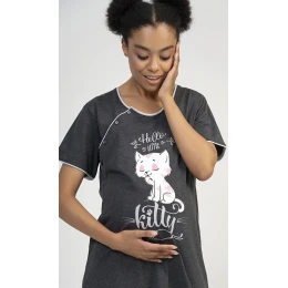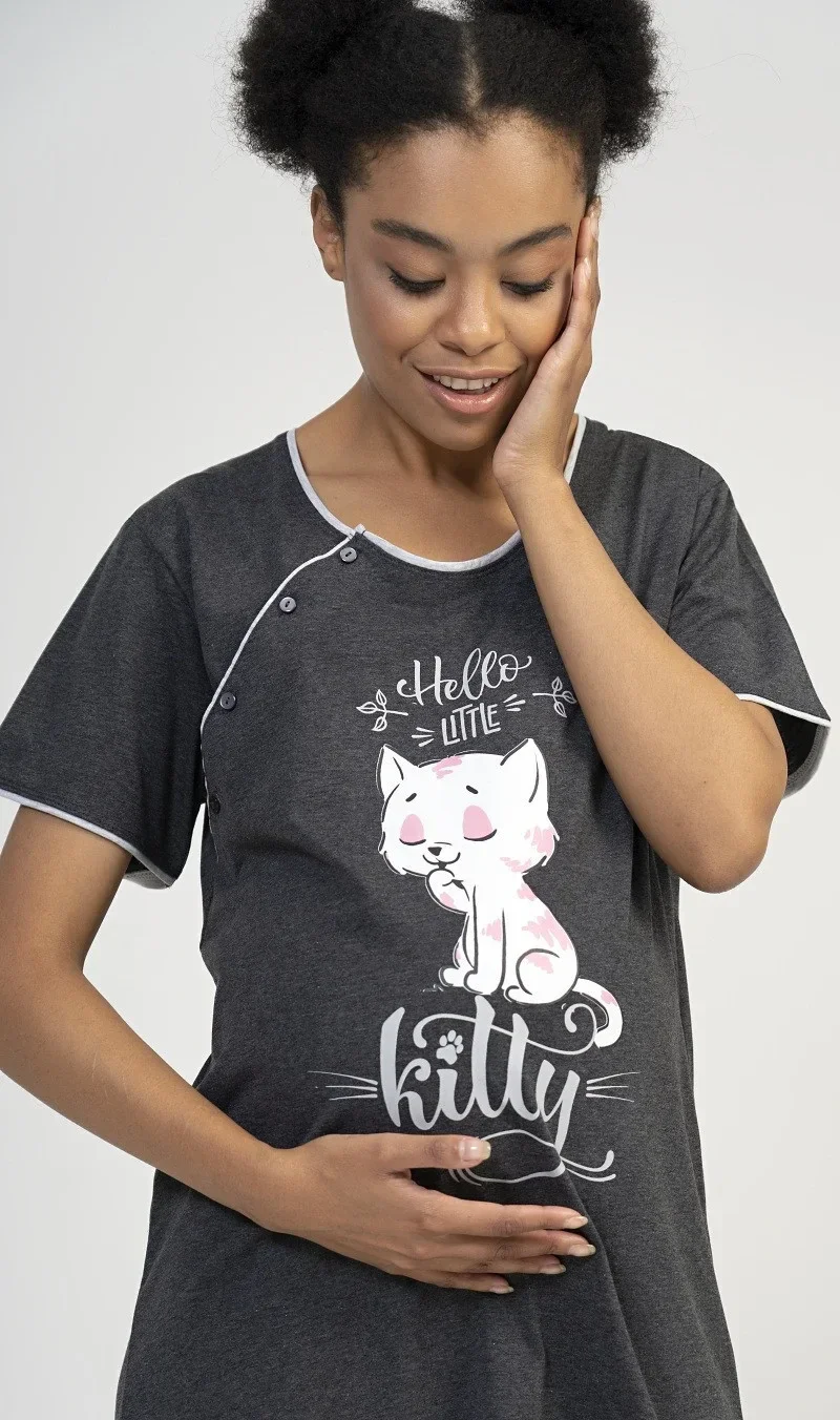 Dámská mateřská noční košile Little cat. Mateřská noční košilka je svým střihem určená na dobu těhotenství, do porodnice i ke kojení. Ke kojení slouží průstřihy po stranách košile, které jsou uzavíratelné na knoflíky. Na hrudi je obrázek roztomilé kočičky s nápisem 'Hello Little kitty'. Použitý materiál s podílem bavlny 100% (70% u tmavě šedé barvy) je příjemný a poddajný na dotek.