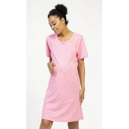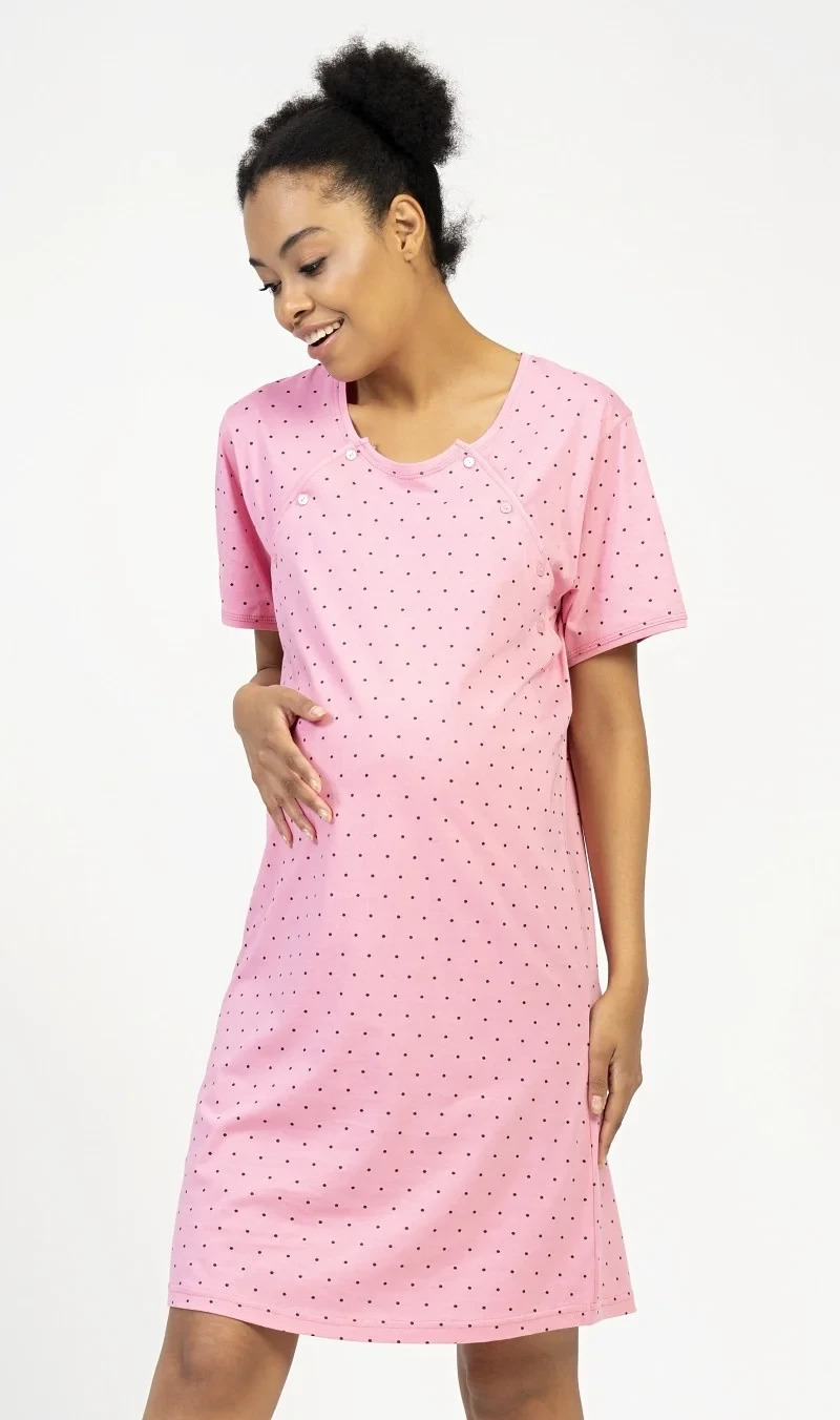 Dámská bavlněná mateřská noční košile Martina. Dámská noční košile mateřská je svým střihem určená na dobu těhotenství, do porodnice i ke kojení. Ke kojení slouží průstřihy po stranách košile, které jsou uzavíratelné na knoflíky. Látka noční košile je potištěna jemným puntíčkem a ozdobena lemem u výstřihu a rukávů v barvě puntíků. Použitý materiál s obsahem bavlny 100% je příjemný a poddajný na dotek.