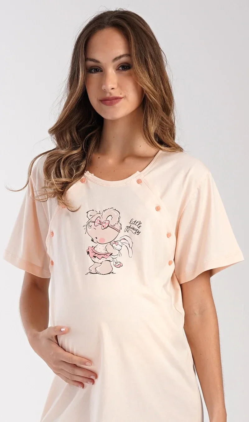 Dámská bavlněná mateřská noční košile Maruška. Noční košile je svým střihem určená na dobu těhotenství, do porodnice i ke kojení. Ke kojení slouží průstřihy po stranách košile, které jsou uzavíratelné na knoflíky. Jednobarevná košile je na hrudi ozdobena obrázkem malého medvídka. Použitý materiál s podílem bavlny 100% je příjemný a poddajný na dotek.