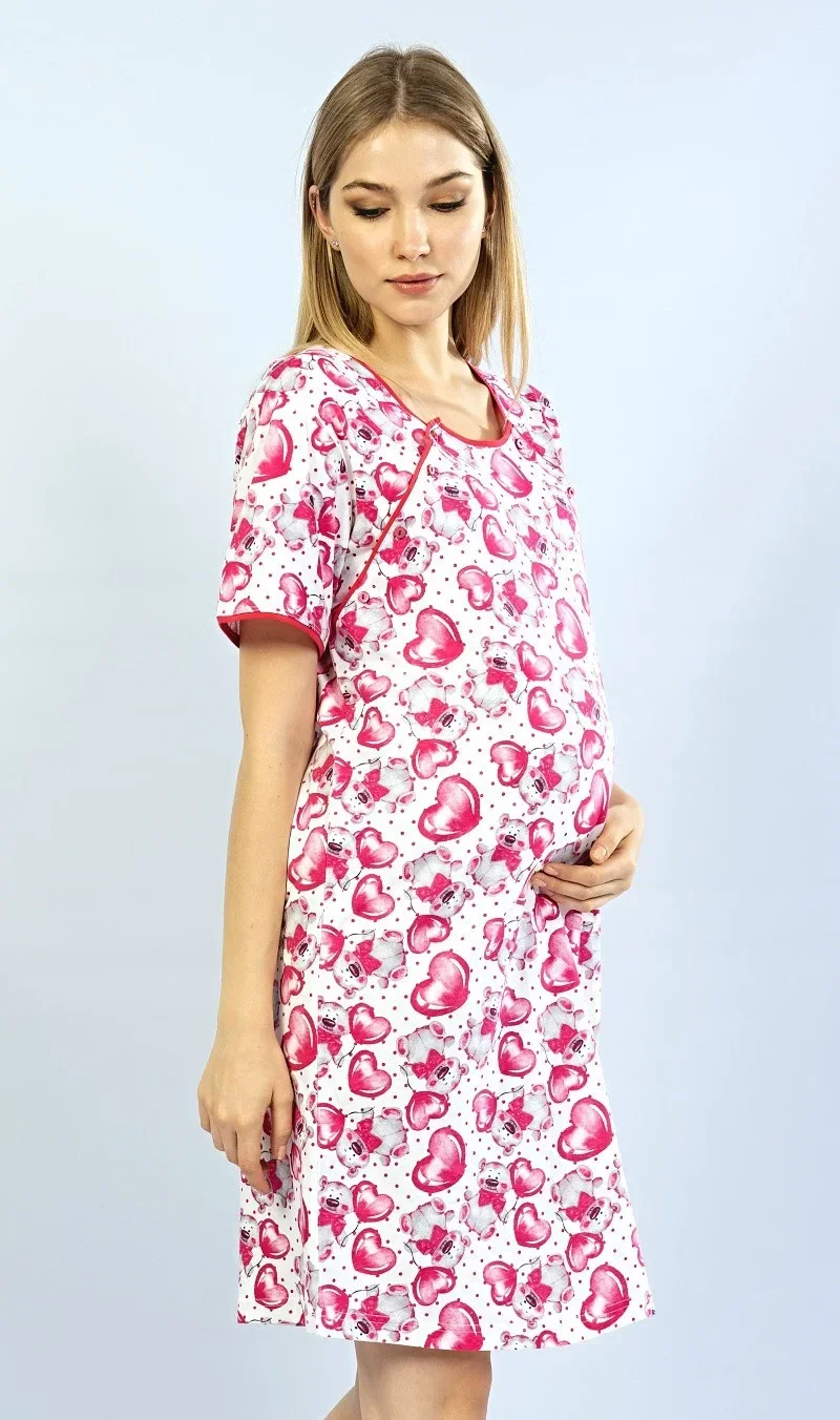 Dámská bavlněná mateřská noční košile Méďa se srdcem. Noční košile je svým střihem určená na dobu těhotenství, do porodnice i ke kojení. Ke kojení slouží průstřihy po stranách košile, které jsou uzavíratelné na knoflíky. Na puntíkatém podkladu košile jsou roztomilí medvídkové se srdíčkovými balonky. Použitý materiál s podílem bavlny 100% je příjemný a poddajný na dotek.