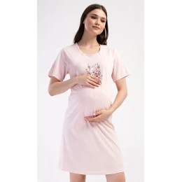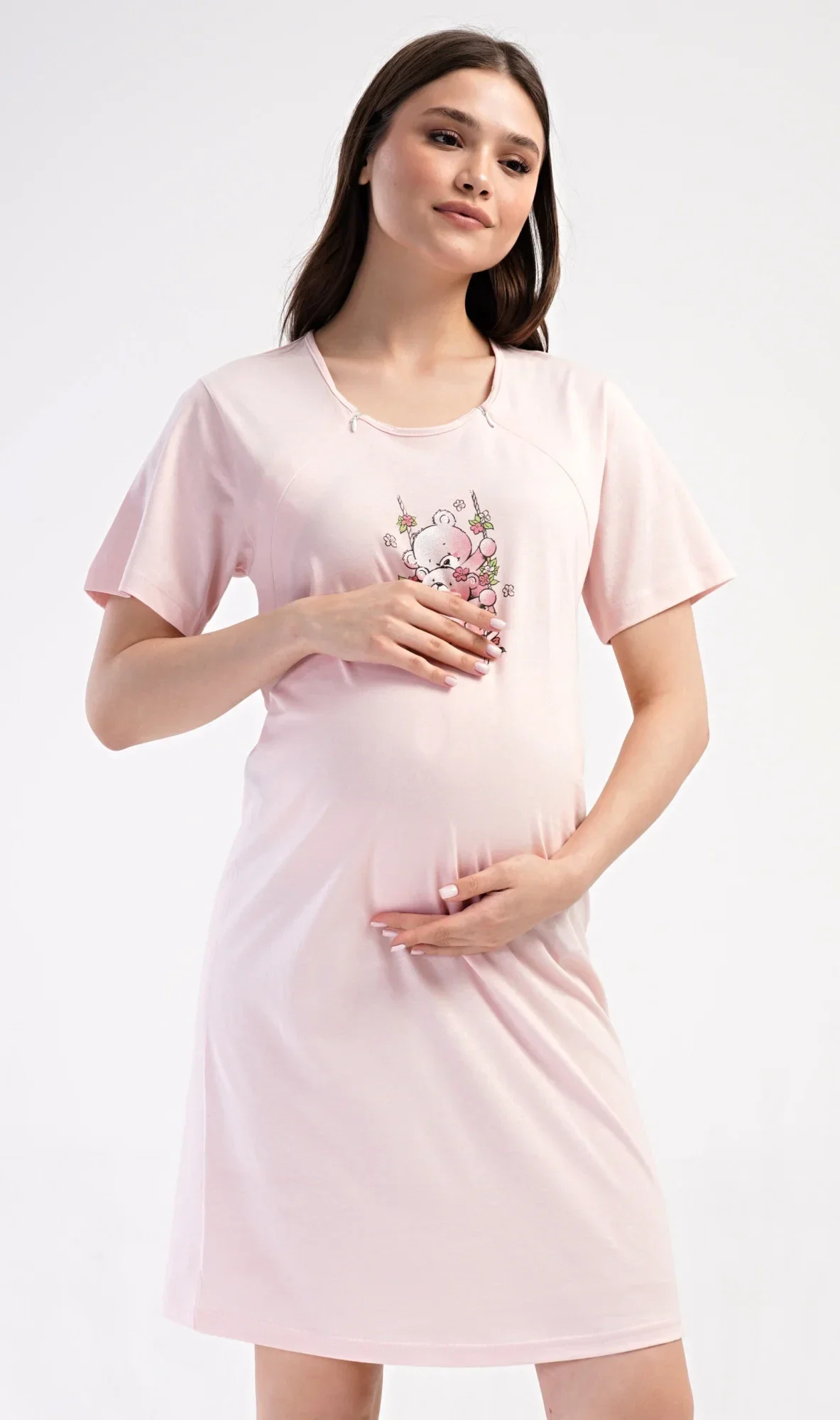 Dámská bavlněná mateřská noční košile Medvídci. Noční košile je svým střihem určená na dobu těhotenství, do porodnice i ke kojení. Ke kojení slouží průstřihy po stranách košile, které jsou uzavíratelné na zip. Přední díl košile zdobí obrázek medvídků na houpačce. Použitý materiál s podílem bavlny 100% je příjemný a poddajný na dotek.