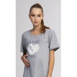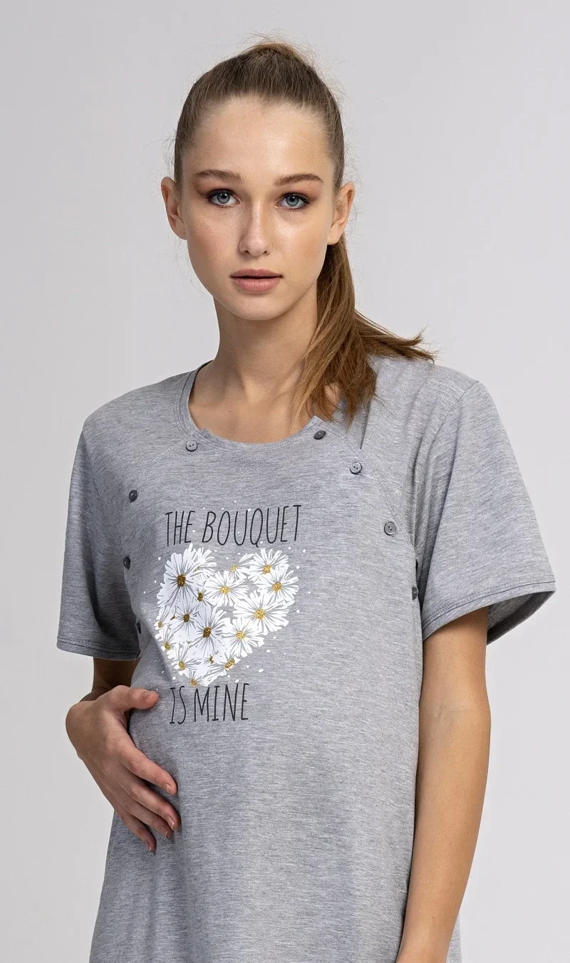 Dámská mateřská noční košile Srdce z kopretin. Dámská noční košile je svým střihem vhodná na období těhotenství, do porodnice, i ke kojení. Ke kojení slouží průstřihy po stranách košile, které jsou uzavíratelné na knoflíky. Na hrudi jinak jednobarevné košilky je srdíčko z kopretin s popisem 'The Bouguet is mine'. Použitý materiál s podílem bavlny 70% je příjemný a poddajný na dotek.