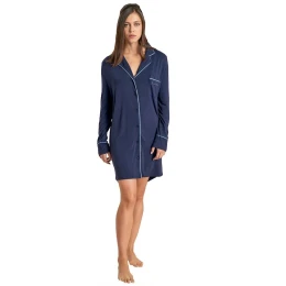 Dámská noční košile španělské značky Muydemi. Košile je košilového střihu, okolo krku je límeček, který má kulaté klopy. Noční košile je celopropínací. Vepředu je našitá kapsička na které je natištěný nápis. Rukávy jsou do jednoduché manžety. Délka košile je nad kolena. Spodní část košile je lehce do kulata. Vnitřní část košile je mírně počesaná chloupkem.