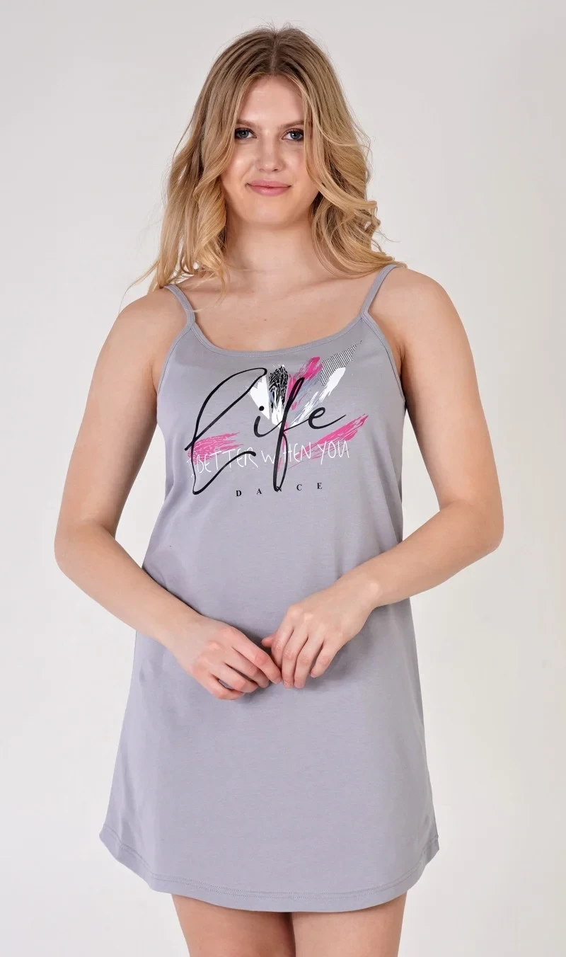 Dámská bavlněná noční košile na ramínka Life. Dámská noční košilka na ramínka s barevným potiskem a nápisem 'Life is better when you dance'. Použitý materiál s obsahem bavlny 100% je příjemný a poddajný na dotek.