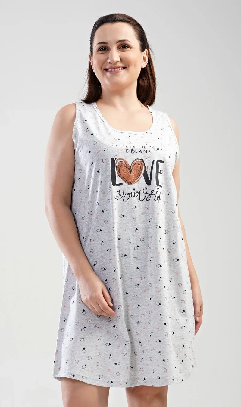 Dámská noční košile na ramínka Love. Dámská noční košile na široká ramínka má na hrudi nápis 'Believe in your dreams - Love yourself'. Látka košile je potištěna drobnými srdíčky. Použitý materiál je příjemný a poddajný na dotek. Košile je vhodná i na denní nošení.