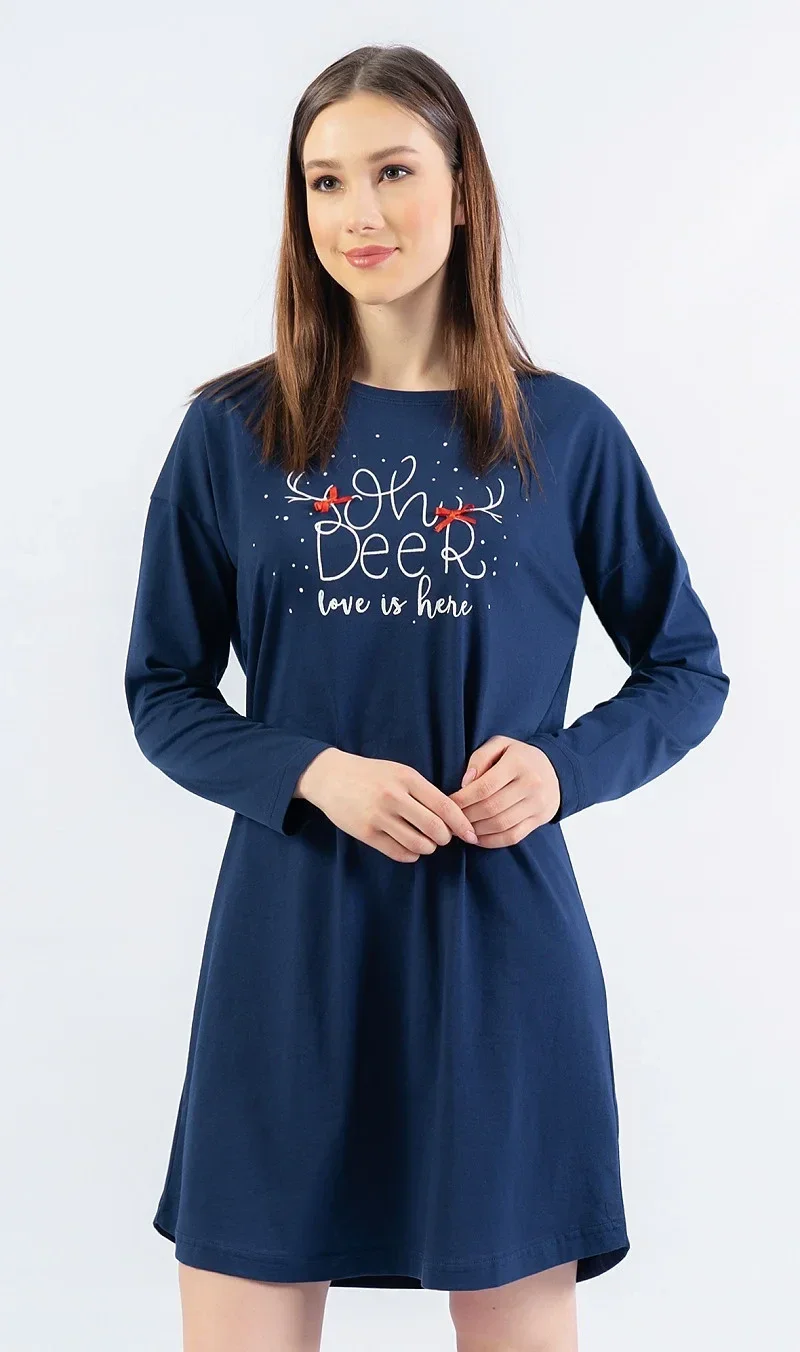 Dámská bavlněná noční košile s dlouhým rukávem Oh deer. Noční košile má na hrudi nápis 'Oh deer, love is here'. K nápisu jsou připojeny dva jelení parůžky a červené mašličky. Použitý bavlněný materiál je příjemný a poddajný na dotek.