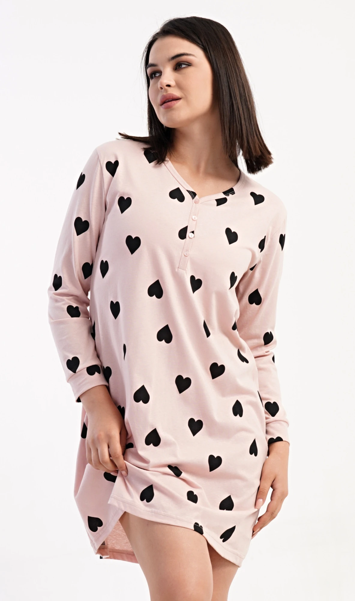 Dámská bavlněná noční košile s dlouhým rukávem Srdce. Noční košile s kulatým výstřihem a légou na knoflíčky má příjemnou délku nad kolena. Látka košile je potištěna srdíčky, dlouhý tukáv je zakončen manžetou. Použitý materiál s podílem bavlny 100% je příjemný a poddajný na dotek.