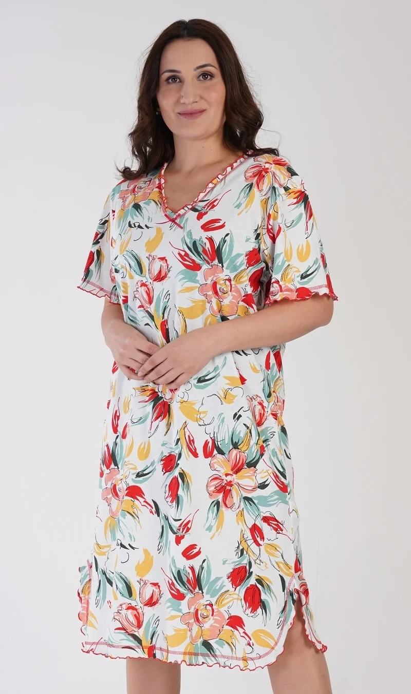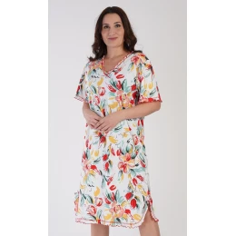 Dámská bavlněná noční košile s krátkým rukávem Alex. Noční košile pro všechny milovníky retra a starých časů s příjemnou délkou pod kolena má ozdobné žlábkování kolem výstřihu, rukávů a spodního lemu. Na látce košile jsou natištěny florální motivy. Použitý bavlněný materiál je příjemný a poddajný na dotek.