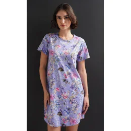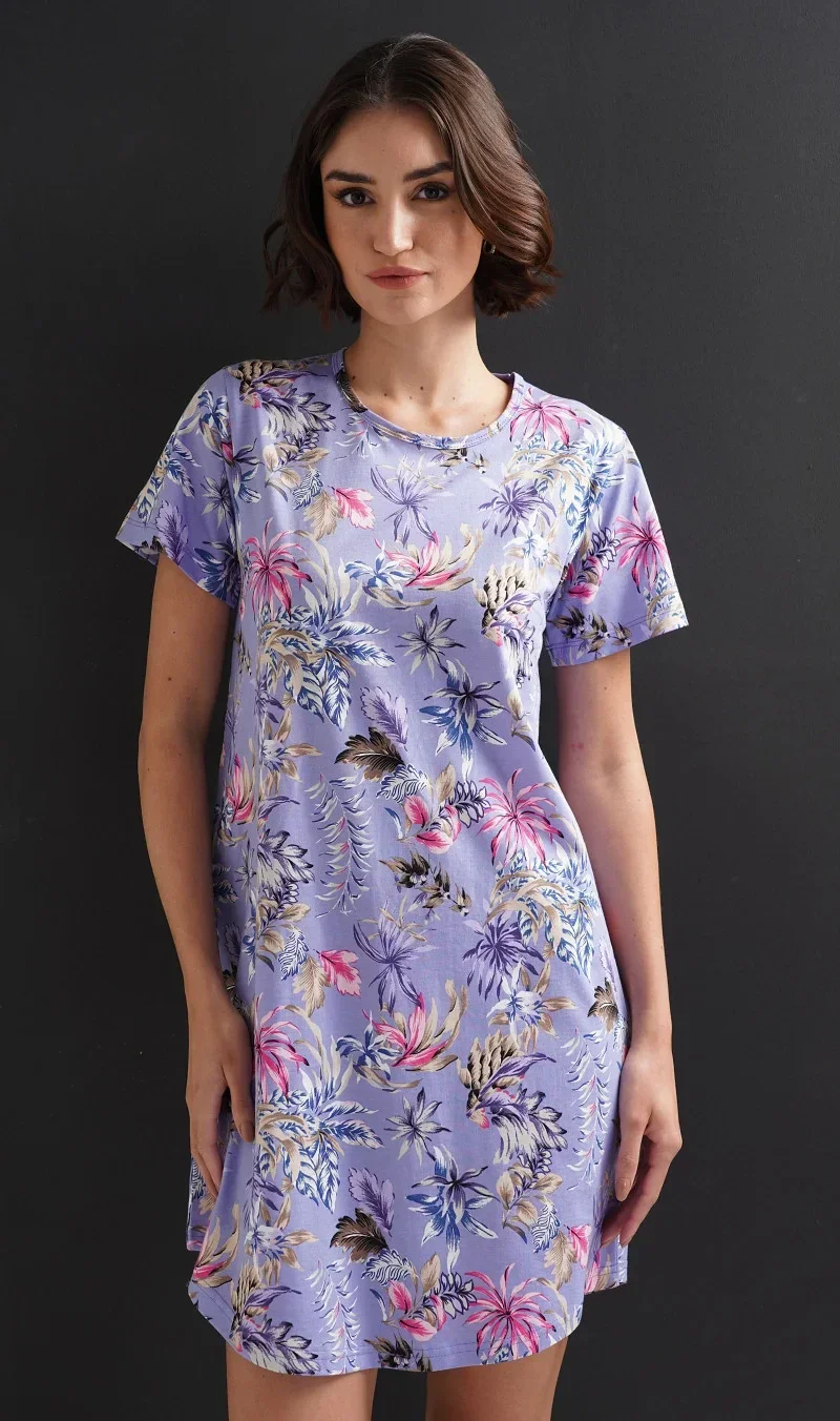 Dámská bavlněná noční košile s krátkým rukávem Alžběta. Dámská noční košile s kulatým výstřihem má příjemnou délkou nad kolena. Košile s krátkým rukávem je potištěna exotickými květy. Použitý bavlněný materiál je příjemný a poddajný na dotek.