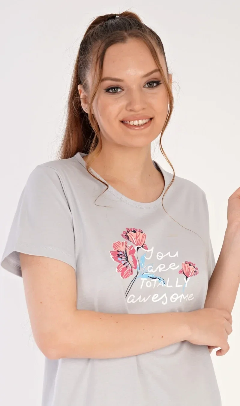Dámská bavlněná noční košile s krátkým rukávem Cassie. Noční košile s kulatým výstřihem má na hrudi obrázek květů a nápis 'You are totally awesome'. Použitý bavlněný materiál je příjemný a poddajný na dotek.