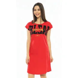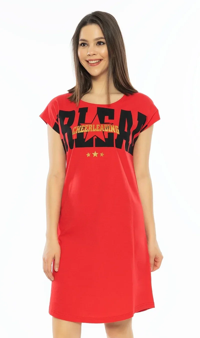 Dámská noční košile s krátkým rukávem Cheerleading. Noční košilka s kulatým výstřihem má na hrudi velký nápis RELAX doplněný zlatým nápisem a třemi hvězdičkami. Použitý materiál je příjemný a poddajný na dotek. Obsah bavlny u červené barvy je 100% a u tmavě šedé 70%. Košile je vhodná i na denní nošení jako letní šaty.