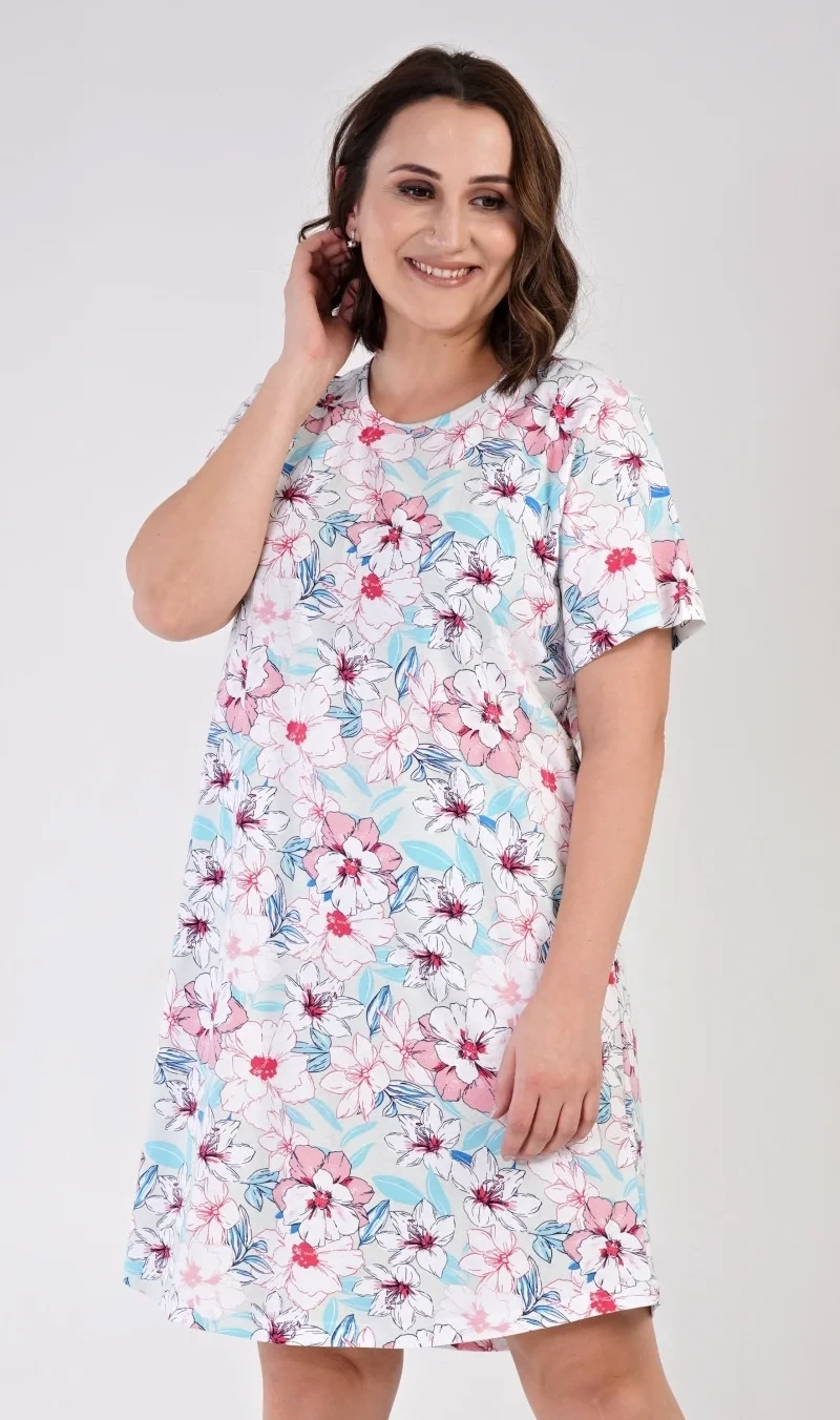 Dámská bavlněná noční košile s krátkým rukávem Elen. Dámská noční košilka s příjemnou délkou nad kolena má kulatý výstřih. Na látce košile jsou natištěny květinové motivy. Použitý bavlněný materiál je jemný a poddajný na dotek.