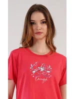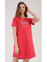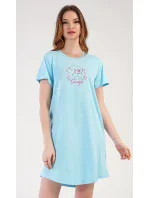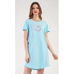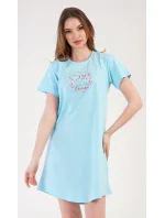 Dámská bavlněná noční košile s krátkým rukávem Eliška. Noční košile s kulatým výstřihem má na hrudi obrázek květu a malý nápis. Použitý bavlněný materiál je příjemný a poddajný na dotek.