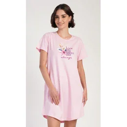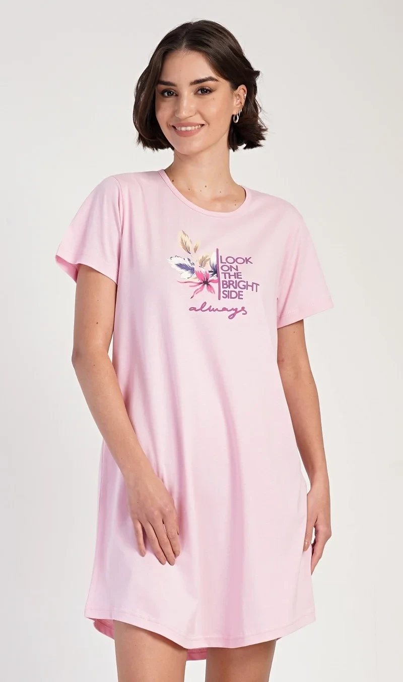 Dámská bavlněná noční košile s krátkým rukávem Elizabeth. Noční košile s kulatým výstřihem a příjemnou délkou nad kolena má na hrudi obrázek exotických květů a nápis 'Look on the bright side always'. Použitý materiál s obsahem bavlny 100% je příjemný a poddajný na dotek.