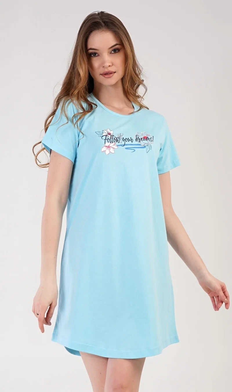Dámská bavlněná noční košile s krátkým rukávem Ella. Noční košili s kulatým výstřihem zdobí obrázek květů a malý nápis 'Follow your dreams'. Použitý bavlněný materiál je příjemný a poddajný na dotek.