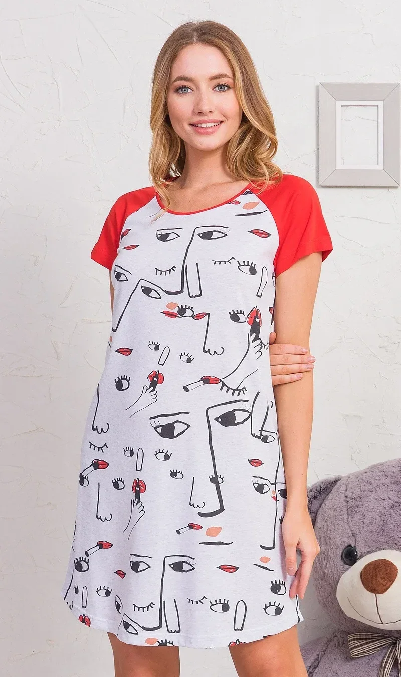 Dámská noční košile s krátkým rukávem Fiona. Noční košile s kulatým výstřihem je potištěna obrázky abstraktních ženských tváří. Použitý materiál s obsahem bavlny 70% je příjemný a poddajný na dotek.