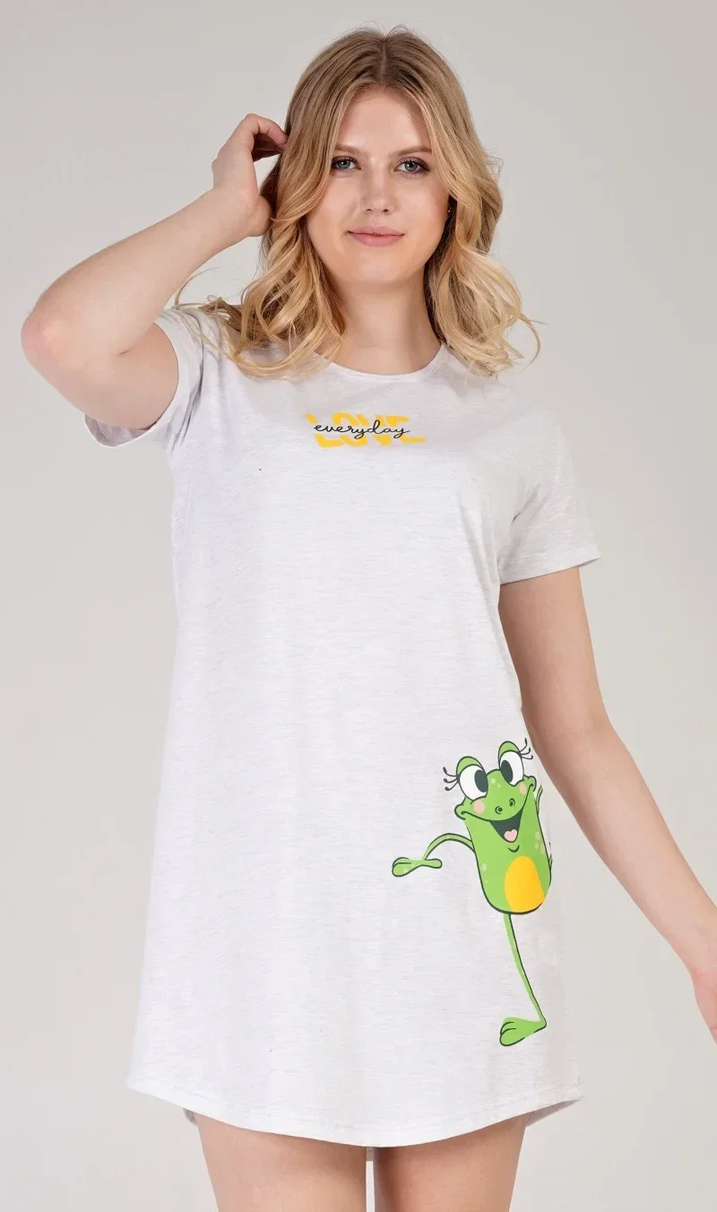 Dámská noční košile s krátkým rukávem Frog. Noční košile s kulatým výstřihem má ve spodní části na boku obrázek veselé žabky a na prsou nápis LOVE EVERYDAY. Použitý materiál s podílem bavlny 70% je příjemný a poddajný na dotek.