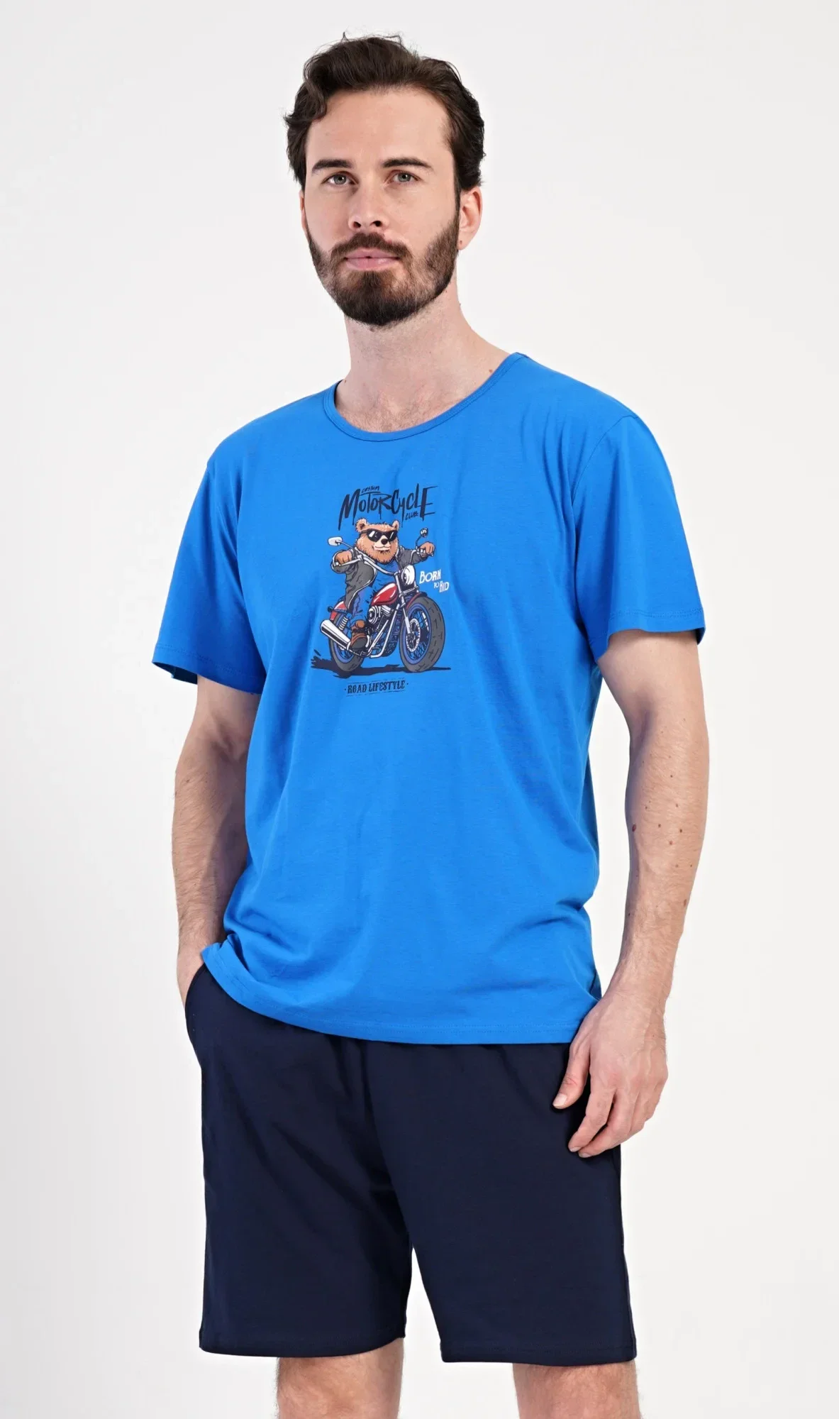 Pánské bavlněné šortkové pyžamo Motorkář. Pánské pyžamo se skládá z trička s krátkým rukávem a krátkých šortkových kalhot. Na jednobarevném tričku je obrázek medvěda na motorce a nápis 'Motorcycle'. Šortky mají praktické kapsy, v pase gumu a šňůrku na stáhnutí. Použitý materiál s podílem bavlny 100% je příjemný a poddaný na dotek. Pyžamo je vhodné i na denní nošení a oceníte ho obzvlášť v horkých letních dnech.