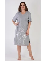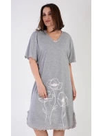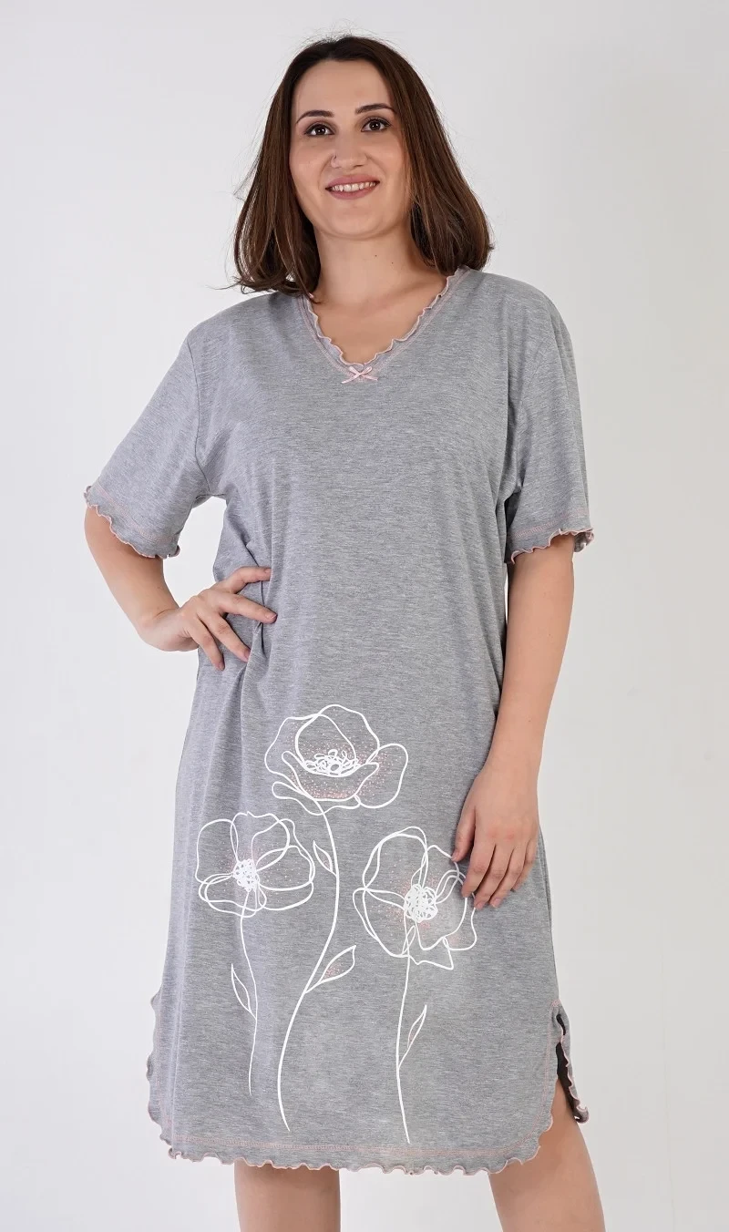 Dámská noční košile s krátkým rukávem Leona. Noční košilka s příjemnou délkou pod kolena má ozdobné žlábkování kolem výstřihu, rukávů a spodního lemu, který je ozvláštněn rozparkem. Ve spodní části jsou natištěny květy v bílo-lososové barvě. Použitý materiál s obsahem bavlny 70% je příjemný a poddajný na dotek.