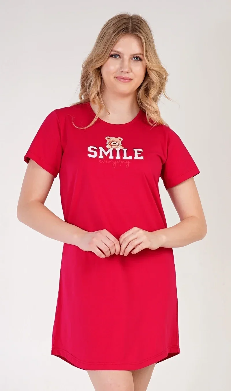 Dámská noční košile s krátkým rukávem Méďa Smile. Noční košile s kulatým výstřihem má na hrudi obrázek plyšového medvěda a nápis 'SMILE everyday'. Použitý materiál je příjemný a poddajný na dotek. Obsah bavlny u jahodové barvy je 100% a u světle šedé 70%.