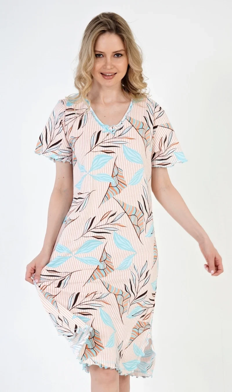 Dámská bavlněná noční košile s krátkým rukávem Melissa. Noční košilka pro všechny milovníky retra a starých časů s příjemnou délkou pod kolena a ozdobným žlábkováním kolem výstřihu, rukávů a spodního lemu, který je ozvláštněn rozparkem. Na látce košile jsou natištěny florální motivy s větvičkami. Použitý bavlněný materiál je příjemný a poddajný na dotek.