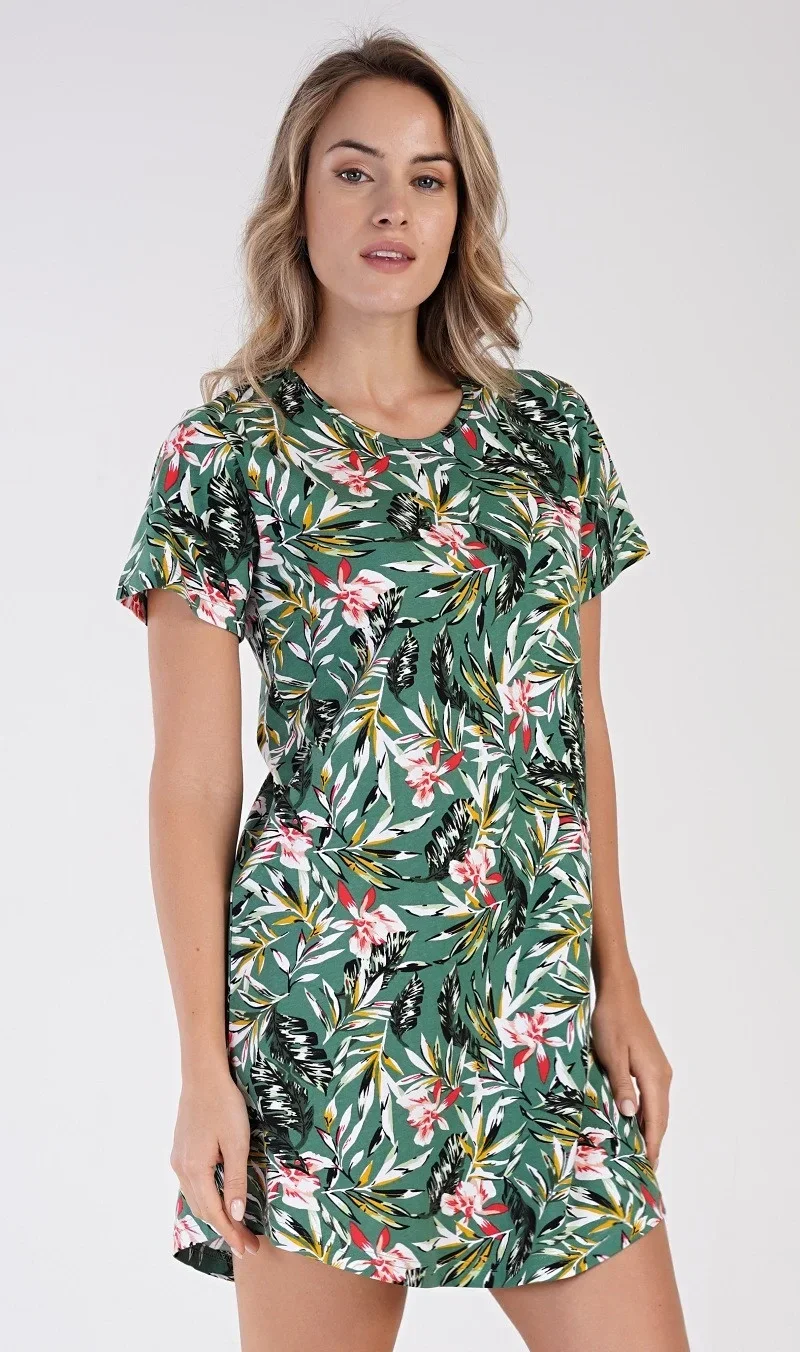 Dámská bavlněná noční košile s krátkým rukávem Michaela. Dámská noční košile s kulatým výstřihem má příjemnou délkou nad kolena. Košile s krátkým rukávem je potištěna motivy džungle, převažuje smaragdová barva. Použitý bavlněný materiál je příjemný a poddajný na dotek.