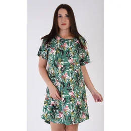 Dámská bavlněná noční košile s krátkým rukávem Michelle. Dámská noční košile s kulatým výstřihem má příjemnou délkou nad kolena. Košile s krátkým rukávem je potištěna motivy džungle, převažuje smaragdová barva. Použitý bavlněný materiál je příjemný a poddajný na dotek.