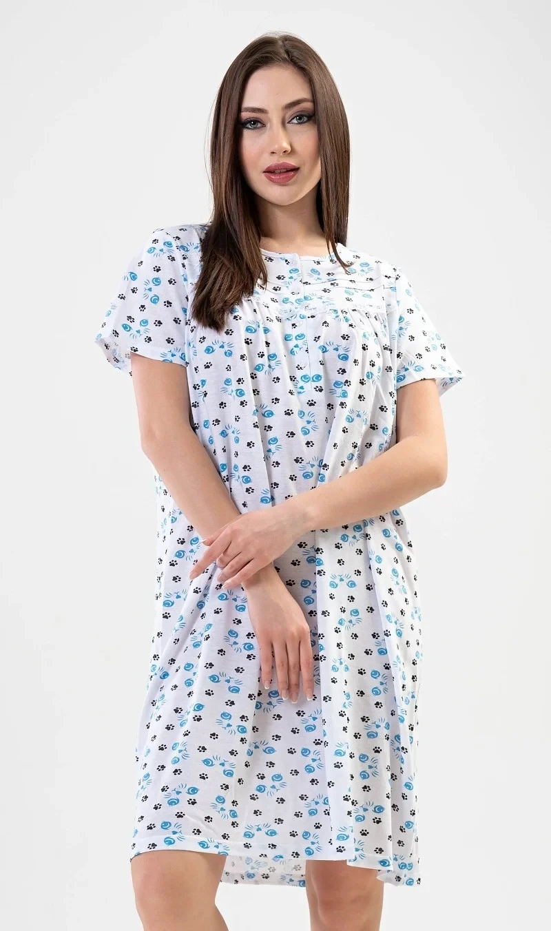 Dámská bavlněná noční košile s krátkým rukávem Monika. Noční košile s celopotiskem kočičích čumáčků má rozepínací légu na knoflíčky a příjemnou délku po kolena. Použitý bavlněný materiál je příjemný a poddajný na dotek.