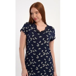 Dámská noční košile s krátkým rukávem Motýlci. Noční košile s příjemnou délkou po kolena má žlábkování na rukávech a spodním lemu, výstřih je ozdoben krajkou. Látka košile je potištěna drobnými motýlky. Použitý viskózový materiál s příměsí lycry je příjemný a poddajný na dotek.