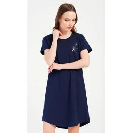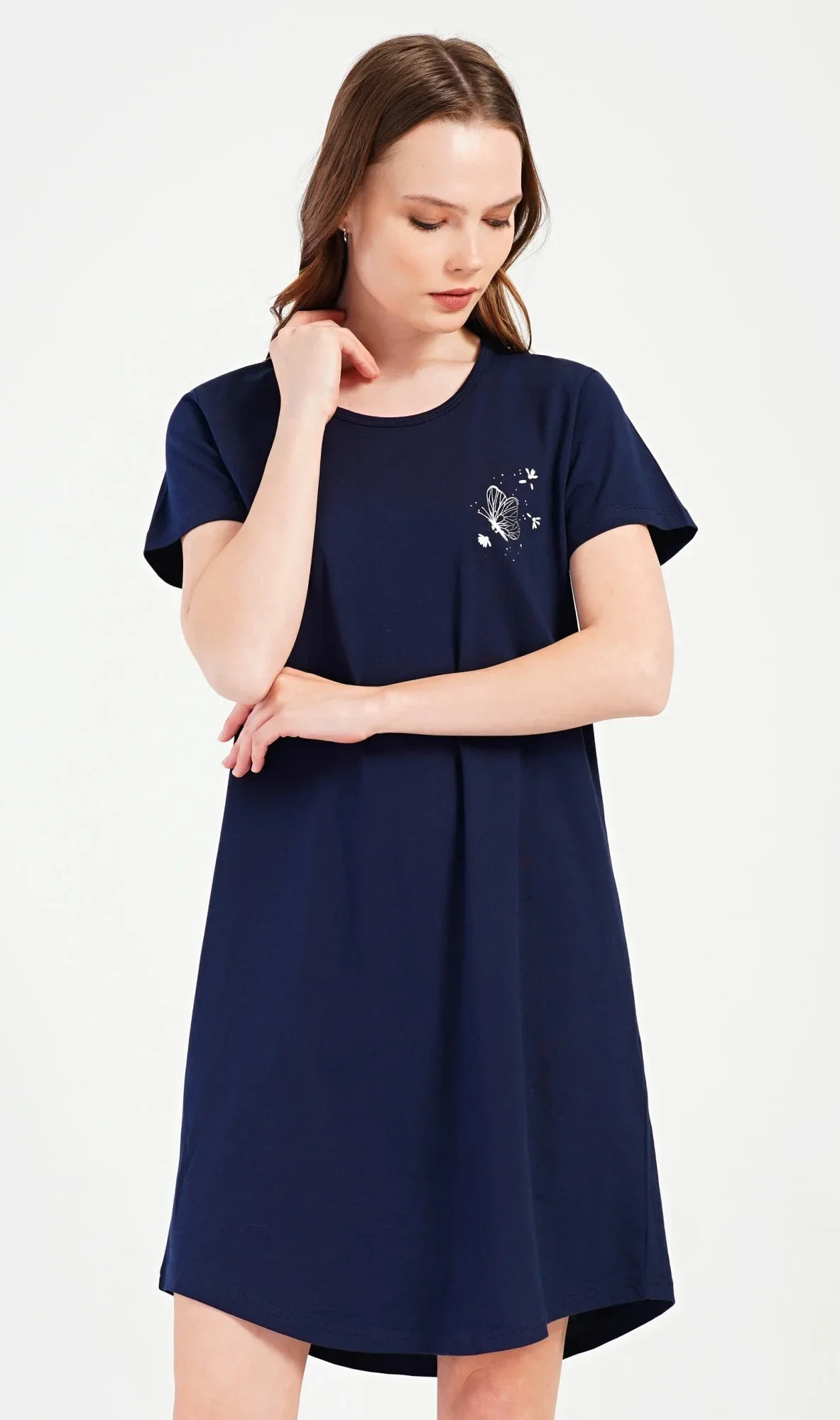 Dámská bavlněná noční košile s krátkým rukávem Motýlek. Noční košile s kulatým výstřihem a příjemnou délkou nad kolena má na hrudi jemný obrázek motýlka. Použitý materiál s obsahem bavlny 100% je příjemný a poddajný na dotek.