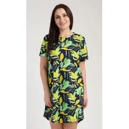 Dámská bavlněná noční košile s krátkým rukávem Paulína. Dámská noční košile s kulatým výstřihem má příjemnou délkou nad kolena. Tmavě modrá košile s krátkým rukávem je potištěna větvičkami a listy v kontrastní žluté a zelené barvě. Použitý bavlněný materiál je příjemný a poddajný na dotek.