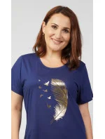 Dámská bavlněná noční košile s krátkým rukávem Peříčko. Dámská noční košile s krátkým rukávem má na přední straně natištěné veliké peříčko s letícímí ptáky v pozadí. Jednobarevný podklad košile dává zlatému potisku pěkně vyniknout. Použitý bavlněný materiál je příjemný a poddajný na dotek. Košile je vhodná i na denní nošení jako domácí nebo letní šaty.